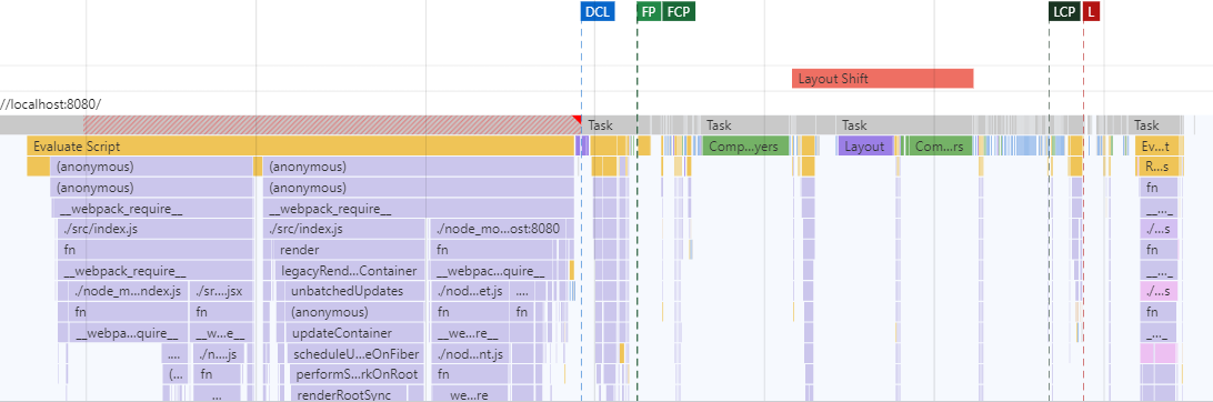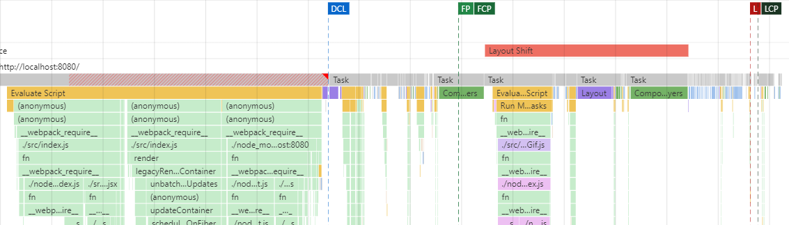 이제 다시 초기 로드 시점을 녹화해보면 두번째 'Evaluate Script' 과정이 LCP 이후로 이동한 것을 확인해보실 수 있습니다.
